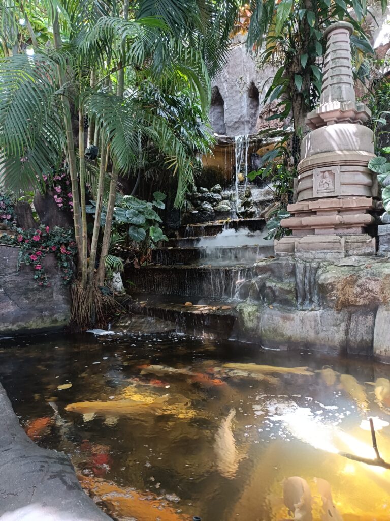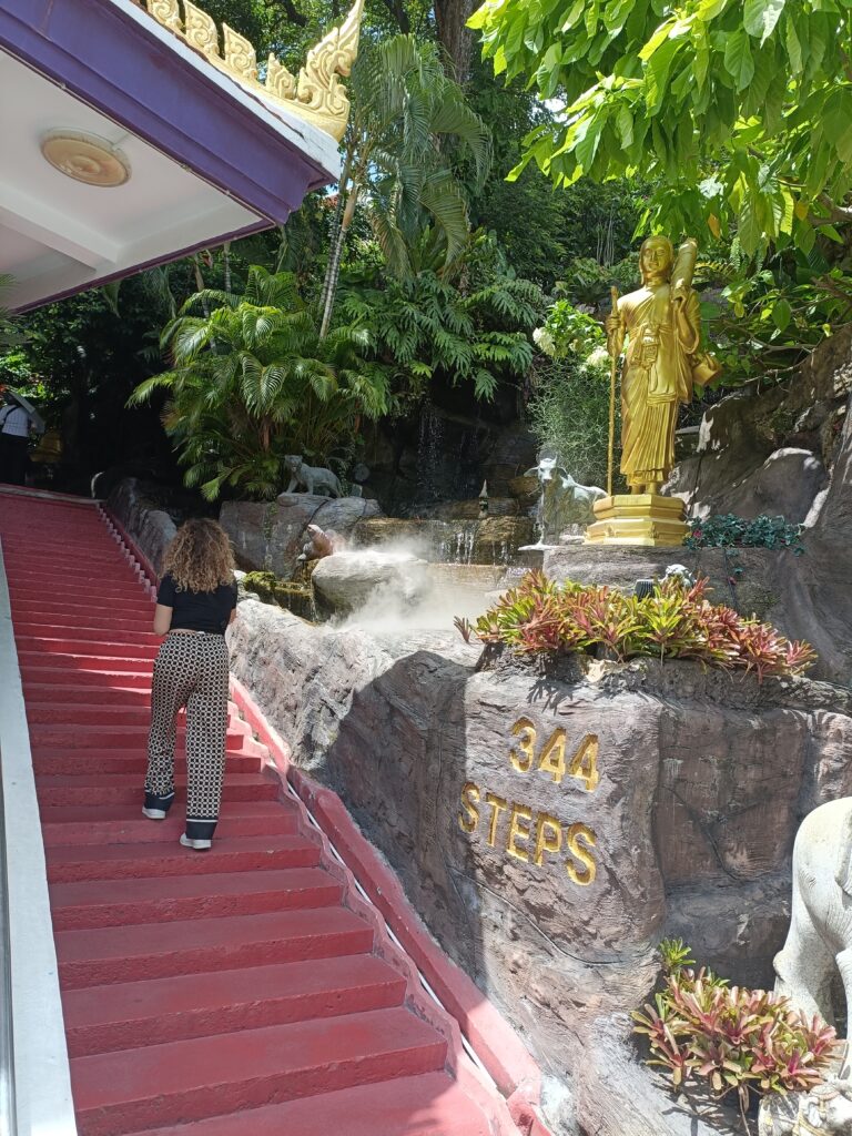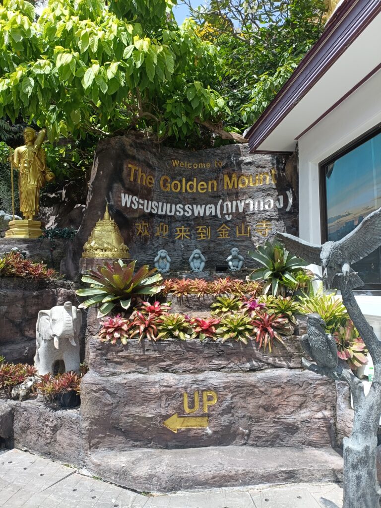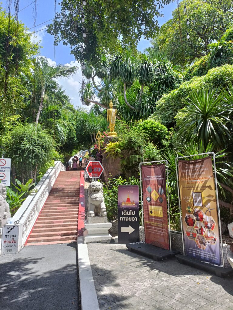 地上から約80メートルの高さの黄金の丘に上がるには、丘へ続く螺旋階段の入口で入場券100バーツを購入する必要があります。階段は登り口と降り口がそれぞれ違う場所にあります。階段一段一段は低めに造られていますが、かなりの距離を上る事になり、一気に頂上まで登るのはなかなかに大変です。階段の途中途中に日陰の休憩所があり、途中にある池の鯉等を眺めながらゆっくりと上がる事もおススメです。