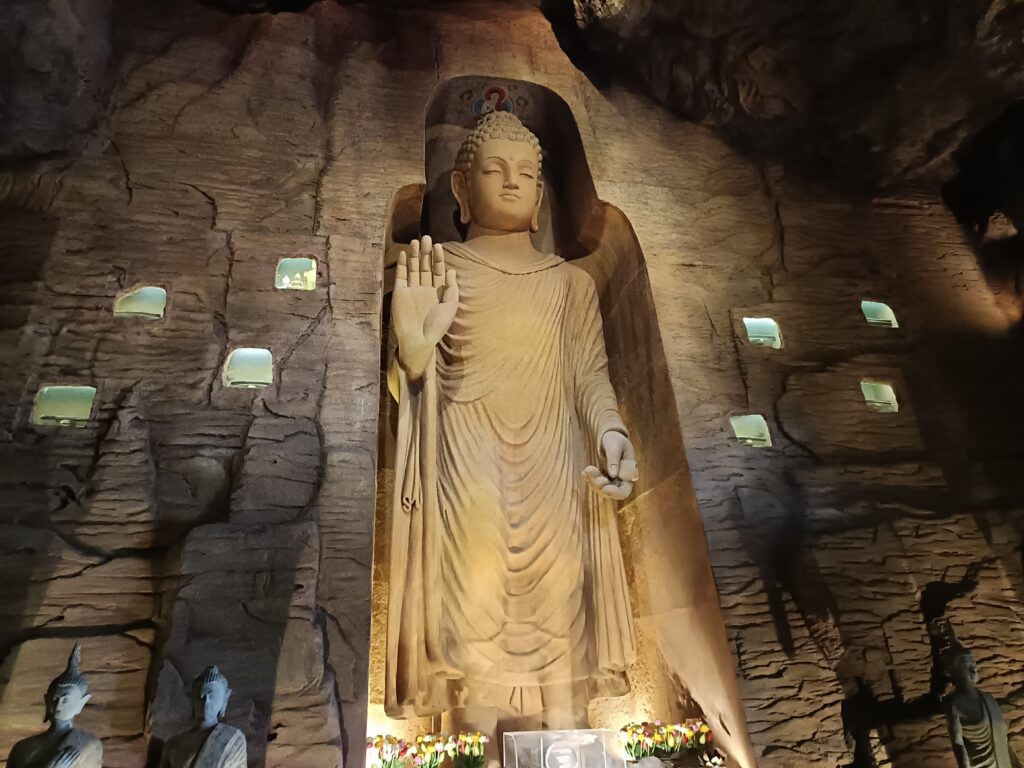 丘の頂上に到着すると、360度バンコクを高所から見渡せる開けた場所になり、頂上には仏舎利が収められている黄金の仏塔と寺院があり、多くの人々が訪れている有名な場所になります。ワット・サケートを観光する場合は、外の暑さと階段の長さが相まって、なかなかに体力を使う観光になりますが、黄金の丘の他にも、タイの仏教の歴史を学べる建造物や、オリジナルが戦争で完全に破壊されてしまったアフガニスタンの岩壁に掘られた巨大仏像と周辺の岩場を再現したレプリカ洞窟も建てられており、こちらは冷房も効いた静かな場所で、ゆっくりと休む事も出来るので、個人的におススメの場所です。