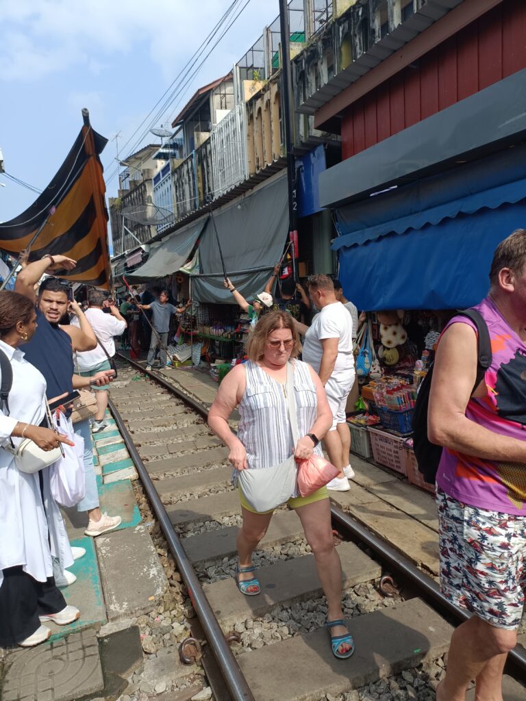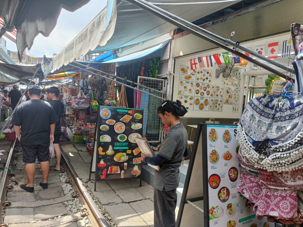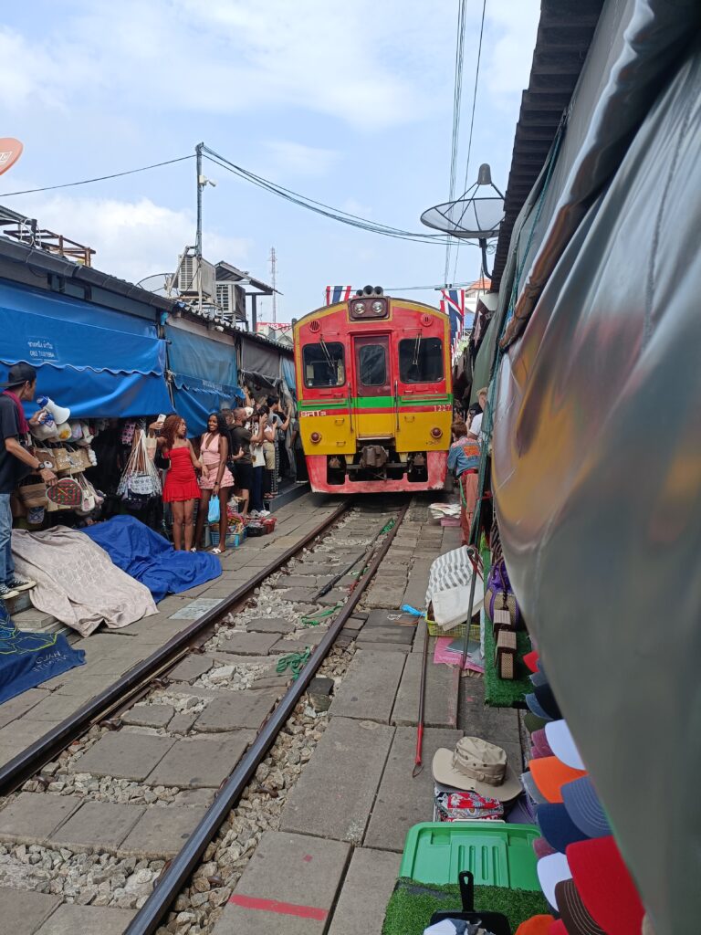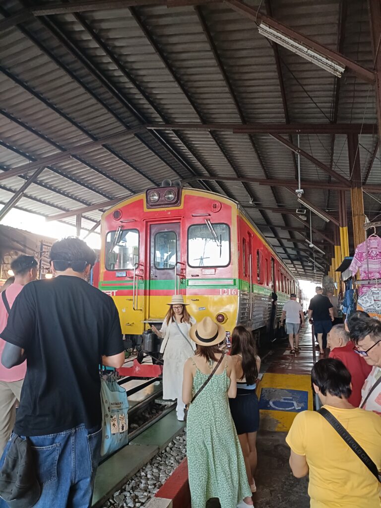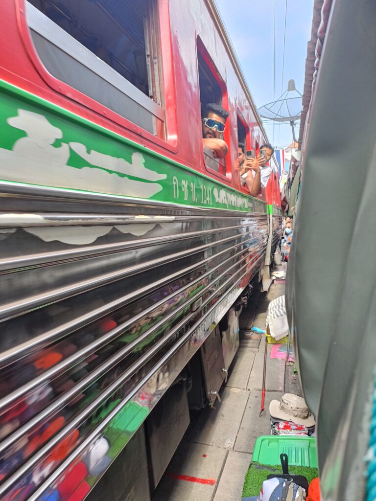 しばらくすると、電車が市場の真ん中を通過します。想像しているよりもお店のスレスレをゆっくりと通っていく電車を至近距離で撮影出来ます。中には電車の乗客と外から握手をする観光客もいたりします。電車が駅に到着して停車した後も、自由に写真を撮影出来ます。日本人の感覚からすると、停車しているとはいえ、電源が入っている電車の車体の外面を触れたり、線路内に侵入して電車をバックに写真を撮ったりと、なんだか少しいけない事をしている気分になり、非常に貴重な体験が楽しめます🚃